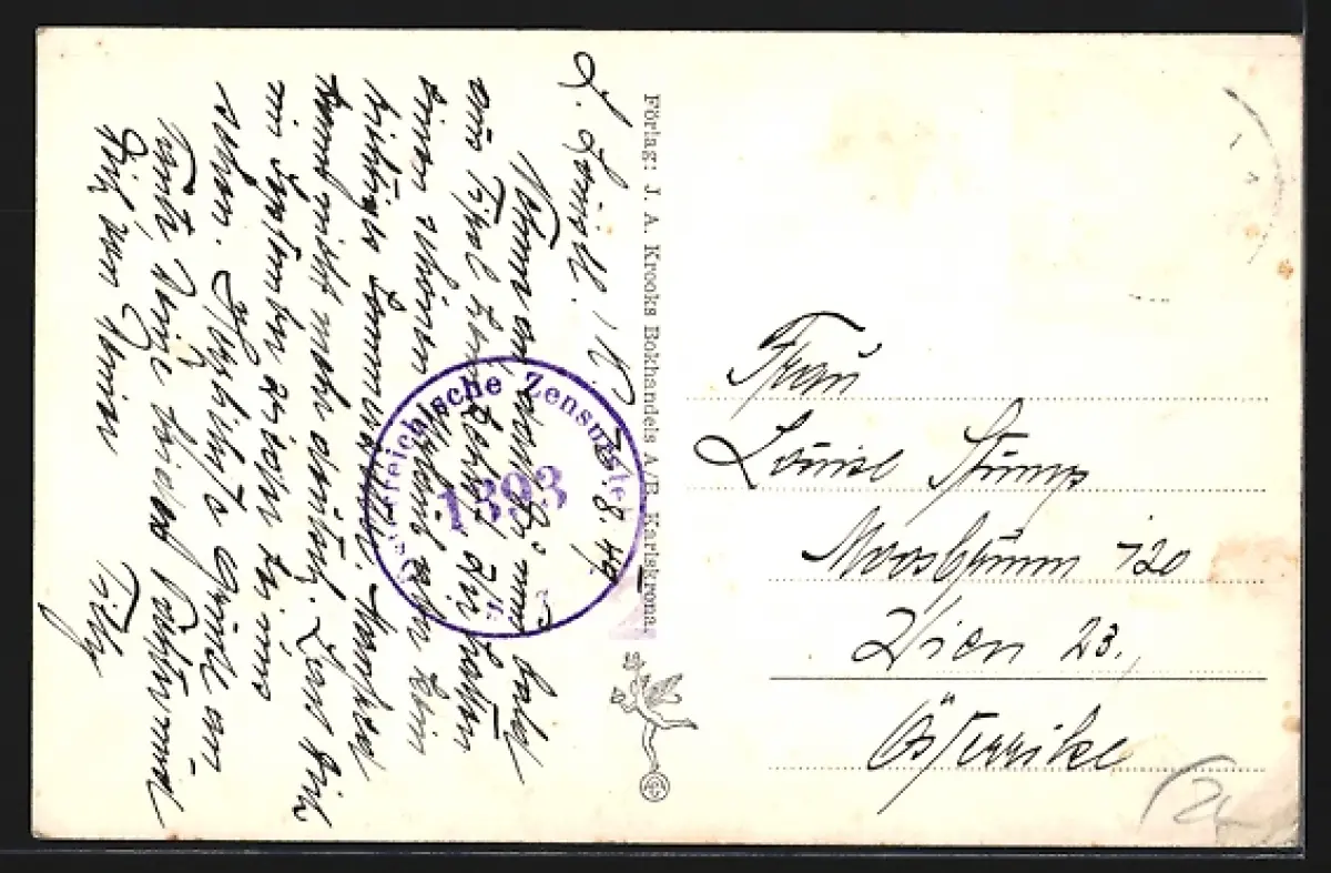 Personenbezogene Daten auf der Rückseite der Karte wurden durch blauen Textmarker unkenntlich gemacht. Die blauen Stellen sind auf die Vorderseite durchgeweicht und wirken sich negativ auf das Postkartenfoto aus