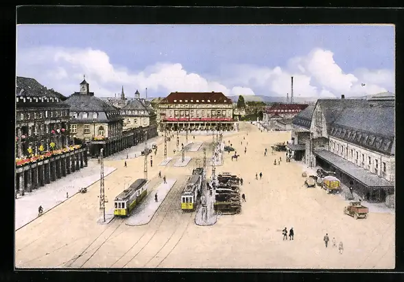 AK Karlsruhe, Bahnhofplatz mit Strassenbahn