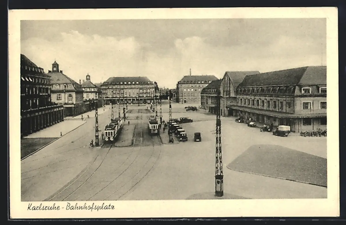 AK Karlsruhe, Bahnhofsplatz mit Strassenbahnen und Automobilen