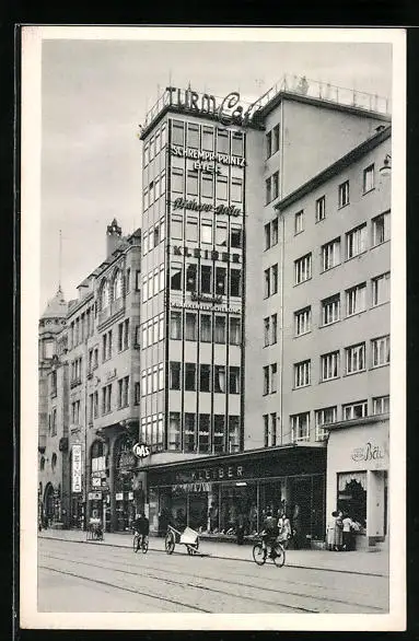 AK Karlsruhe, Blick in die Kaiserstrasse und auf das Turmcafe