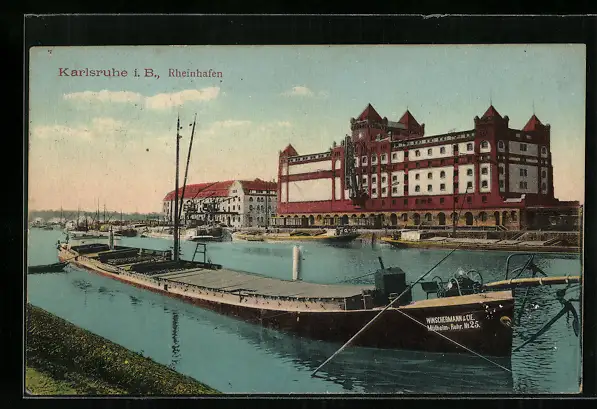 AK Karlsruhe, Frachtschiff Winschermann & Cie., Mühlheim-Ruhr Nr. 25, Speicher, Rheinhafen