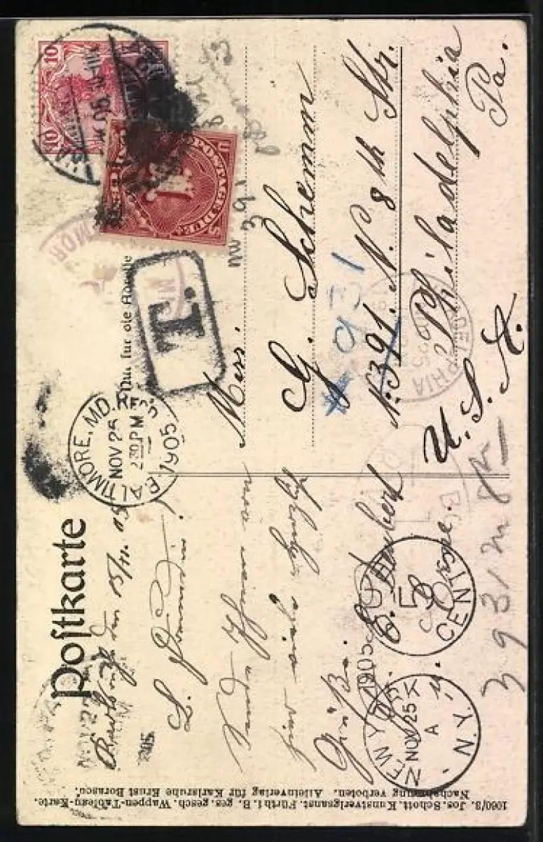 alte Ansichtskarte, gelaufen 1905, Briefmarke entfernt, rückseitig Oberflächenschaden, guter Zustand