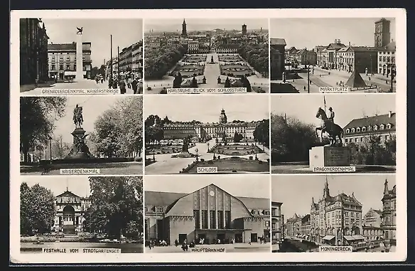 AK Karlsruhe, Kaiserdenkmal, Marktplatz, Hauptbahnhof