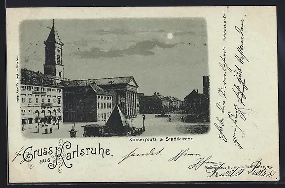 AK Karlsruhe, Kaiserplatz & Stadtkirche bei Vollmond