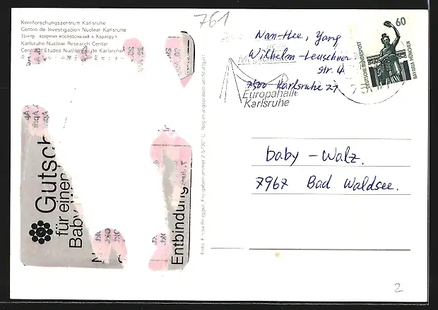 Personenbezogene Daten auf der Rückseite der Karte wurden durch blauen Textmarker unkenntlich gemacht. Die blauen Stellen sind auf die Vorderseite durchgeweicht und wirken sich negativ auf das Postkartenfoto aus