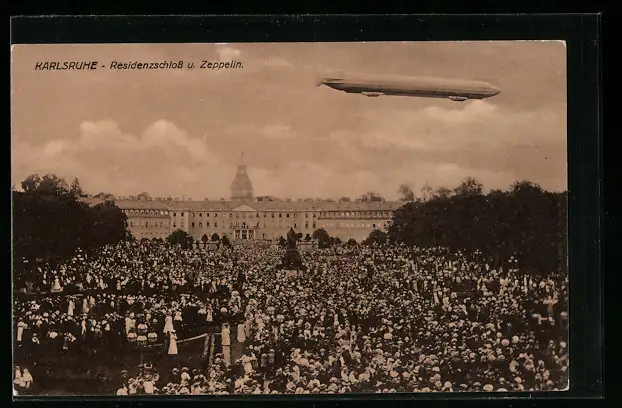 AK Karlsruhe, Luftschiff über dem Residenzschloss, Menschenmenge
