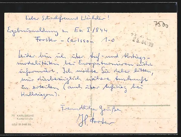 Personenbezogene Daten auf der Rückseite der Karte wurden durch blauen Textmarker unkenntlich gemacht. Die blauen Stellen sind auf die Vorderseite durchgeweicht und wirken sich negativ auf das Postkartenfoto aus