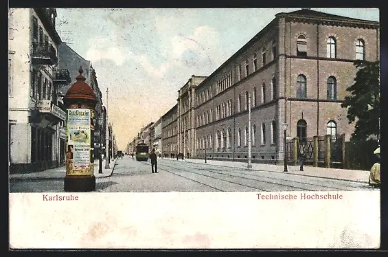 AK Karlsruhe, Technische Hochschule mit Strasse, Litfasssäule
