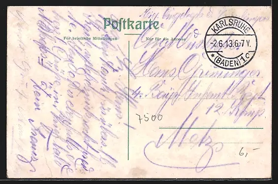 Personenbezogene Daten auf der Rückseite der Karte wurden durch blauen Textmarker unkenntlich gemacht. Die blauen Stellen sind auf die Vorderseite durchgeweicht und wirken sich negativ auf das Postkartenfoto aus