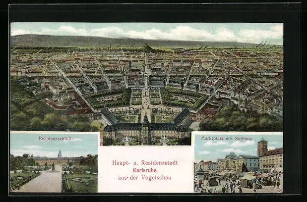 AK Karlsruhe, Totalansicht aus der Vogelschau, Marktplatz mit Rathaus, Residenzschloss