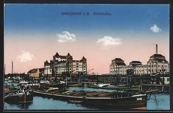 AK Karlsruhe i. B., Der Rheinhafen im Abendrot, Frachtschiff, Speicher