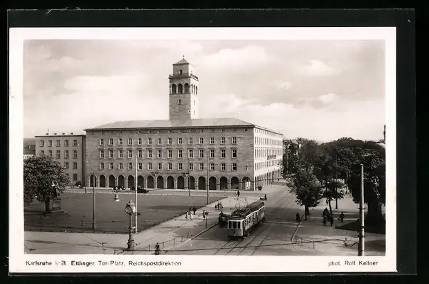 AK Karlsruhe i. B., Ettlinger Tor-Platz mit Reichspostdirektion und Strassenbahn