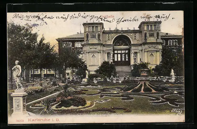 AK Karlsruhe i. B., Festhalle mit Parkanlagen