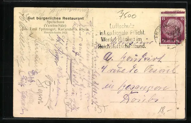 Personenbezogene Daten auf der Rückseite der Karte wurden durch blauen Textmarker unkenntlich gemacht. Die blauen Stellen sind auf die Vorderseite durchgeweicht und wirken sich negativ auf das Postkartenfoto aus