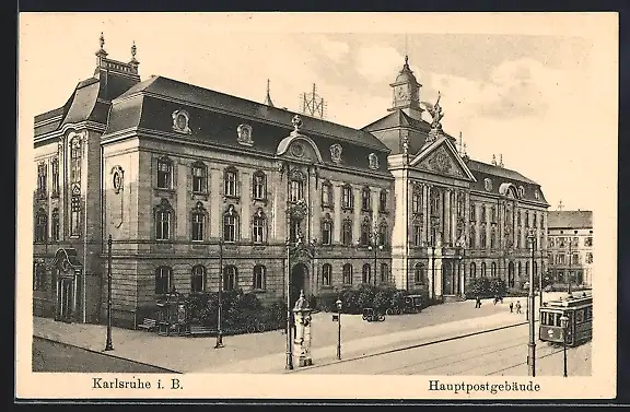 AK Karlsruhe i. B., Hauptpostgebäude mit Strassenbahn
