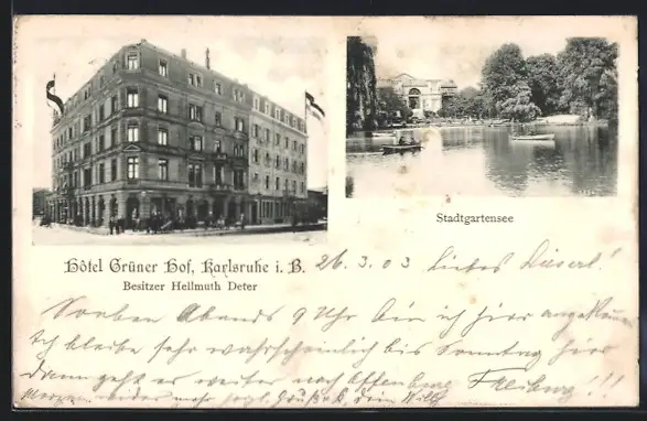 AK Karlsruhe i. B., Hotel Grüner Hof, Bes. Hellmuth Deter, Stadtgartensee