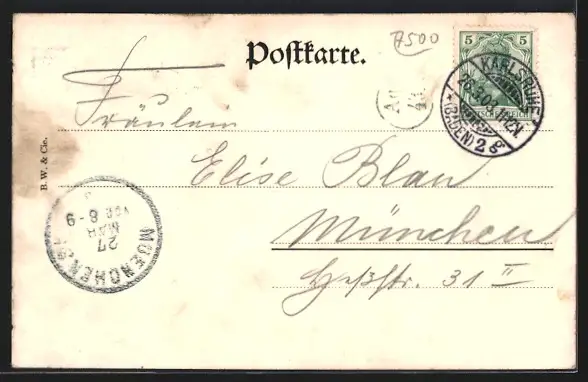 Personenbezogene Daten auf der Rückseite der Karte wurden durch blauen Textmarker unkenntlich gemacht. Die blauen Stellen sind auf die Vorderseite durchgeweicht und wirken sich negativ auf das Postkartenfoto aus