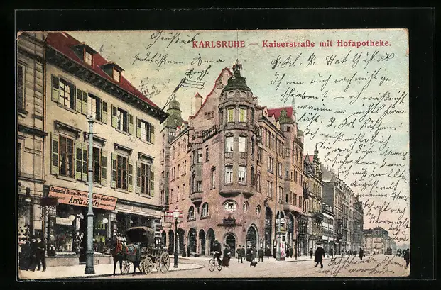 AK Karlsruhe i. B., Kaiserstrasse mit der Hofapotheke