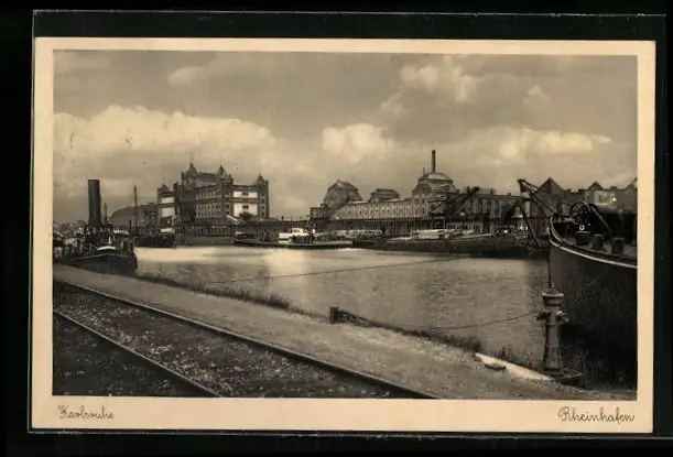AK Karlsruhe i. B., Rheinhafen mit Bahnschienen und Blick auf Gebäude
