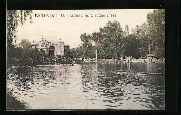 AK Karlsruhe i. B., Stadtgartensee u. Festhalle