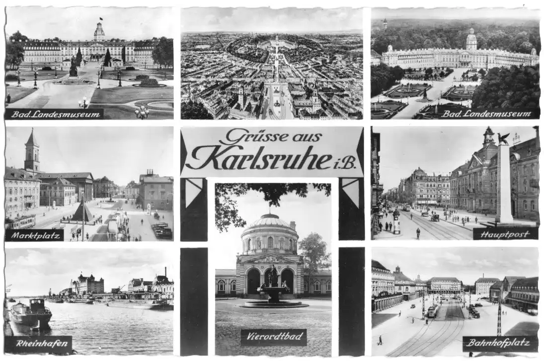 Ansichtskarte Karlsruhe i. B. acht Abb. Erhaltung I-II postalisch gelaufen, gestempelt: (17a) Kahrlsruhe (Baden) 2, 25.3.55 Verlag: keine Angaben