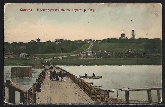 AK Kaschira, Holzbrücke über den Fluss Oka mit Stadtansicht im Hintergrund