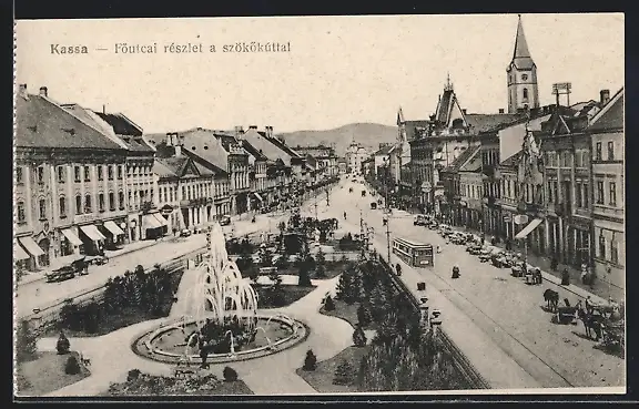 AK Kassa, Föutcai részlet a szökökúttal, Strassenbahn