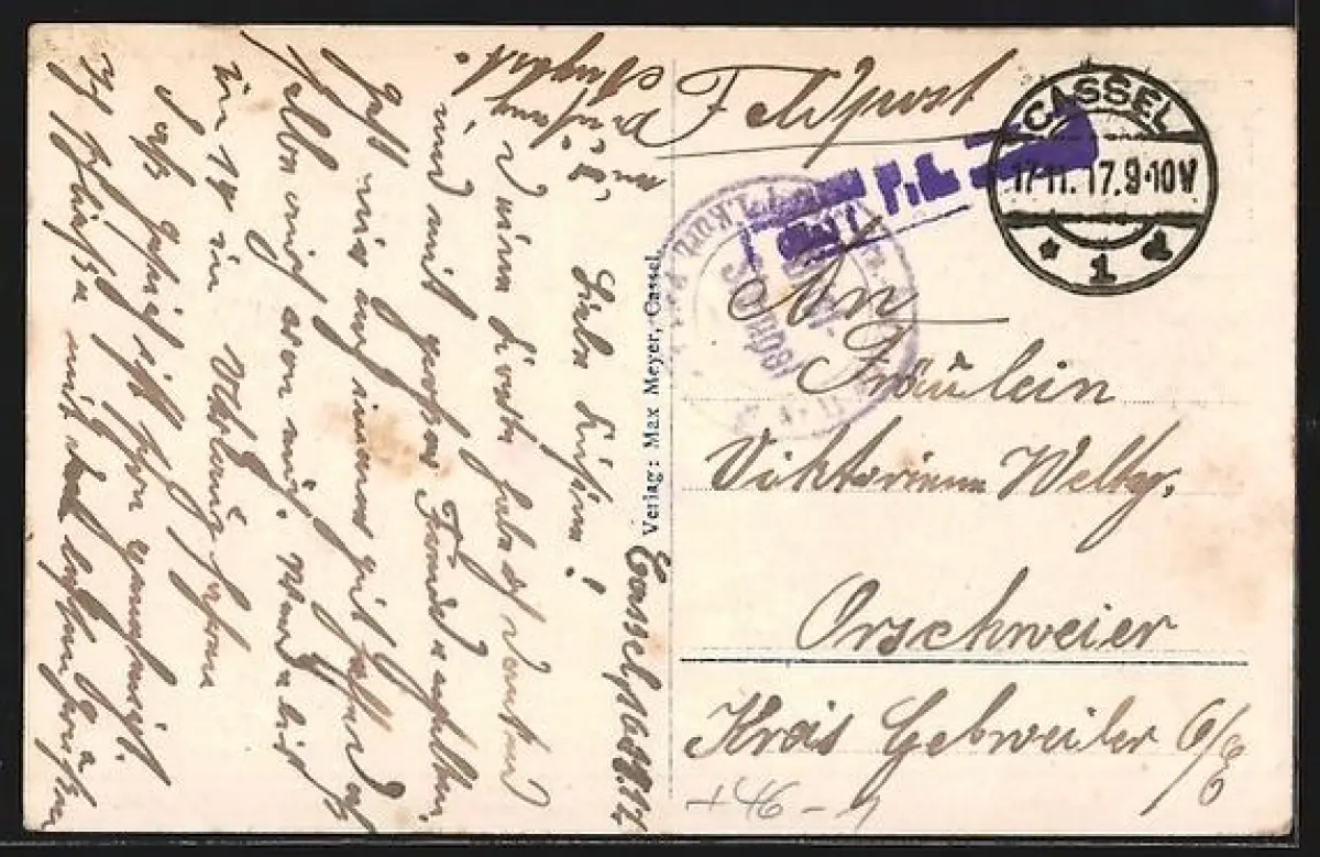 alte Ansichtskarte, gelaufen 1917, Eckknick re. oben, Stempelspur, Bugspur li. unten, guter Zustand