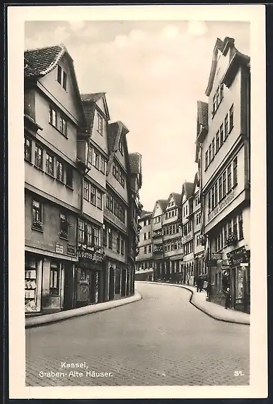 AK Kassel, Strassenpartie am Graben mit alten Häusern & Geschäften
