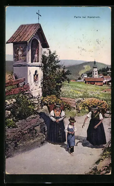 AK Kastelruth, Ortsansicht mit Wegkreuz und Kastelruthern in Trachten