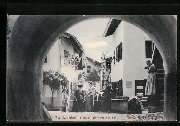 AK Kastelruth am Schlern, Strassenpartie mit Lebensmittelgeschäft durch Torbogen