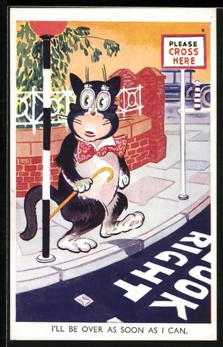 AK Kater mit Fliege und Spazierstock will eine Strasse überqueren