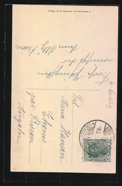 Personenbezogene Daten auf der Rückseite der Karte wurden durch blauen Textmarker unkenntlich gemacht. Die blauen Stellen sind auf die Vorderseite durchgeweicht und wirken sich negativ auf das Postkartenfoto aus
