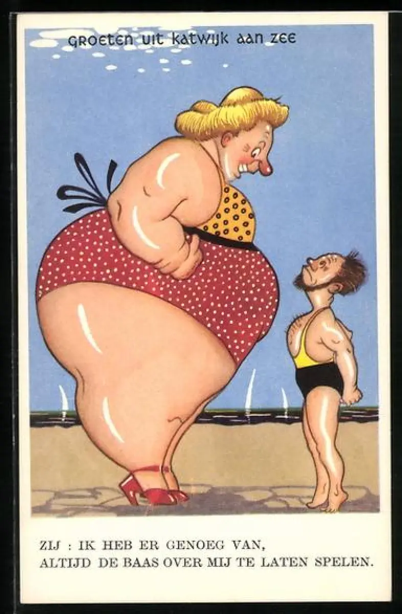 AK Katwijk aan Zee, Dicke Riesendame und schmächtiger Winzling am Strand