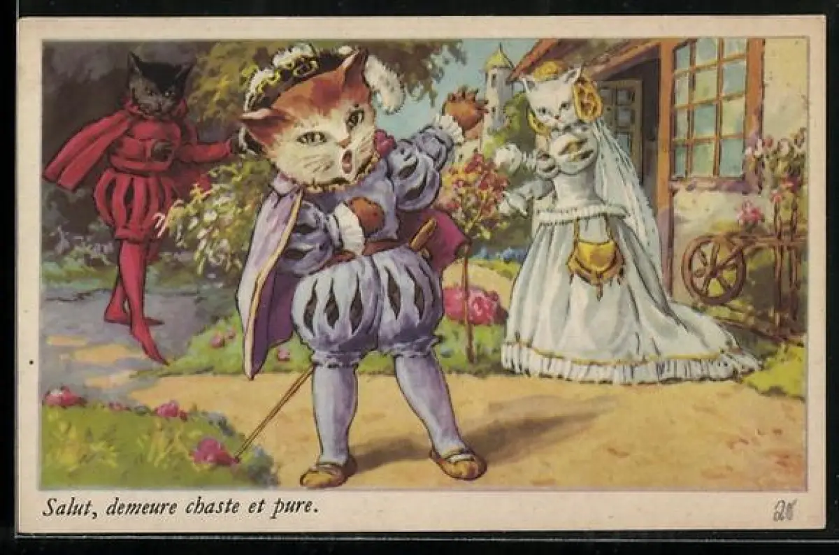 AK Katze in Hofkleidung singt ein Loblied auf eine Katzendame und ihre Tugend