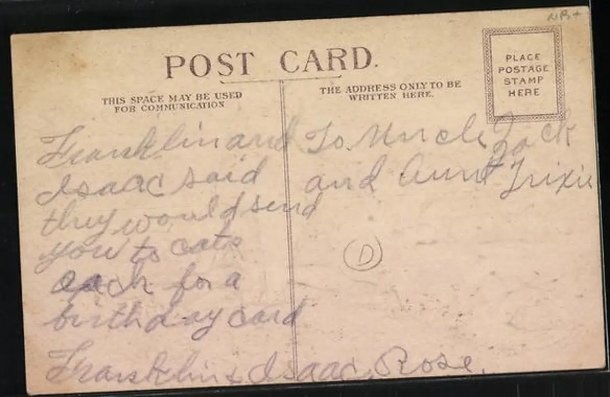 Personenbezogene Daten auf der Rückseite der Karte wurden durch blauen Textmarker unkenntlich gemacht. Die blauen Stellen sind auf die Vorderseite durchgeweicht und wirken sich negativ auf das Postkartenfoto aus
