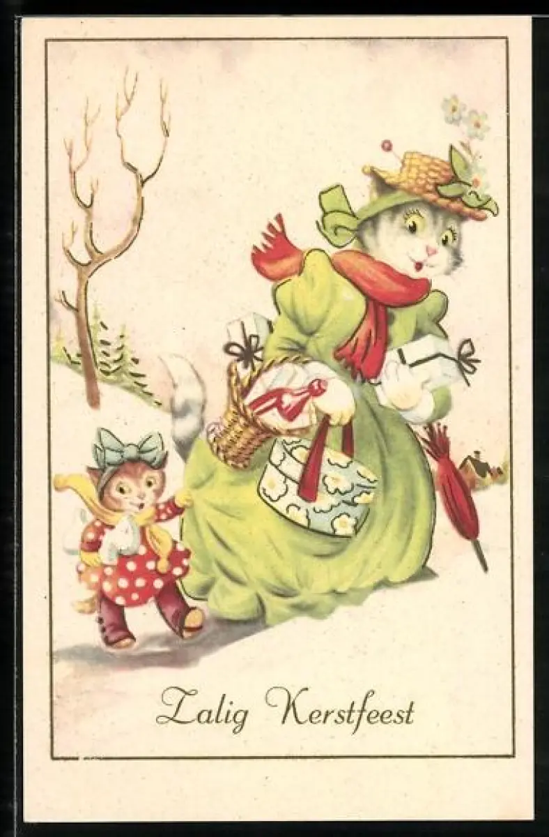 AK Katze mit Paketen und Katzenkind im Winter, Weihnachtsgruss