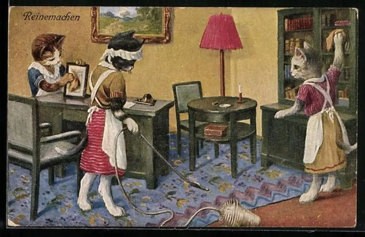 AK Katzen beim Reinemachen in der Stube, vermenschlichte Tiere