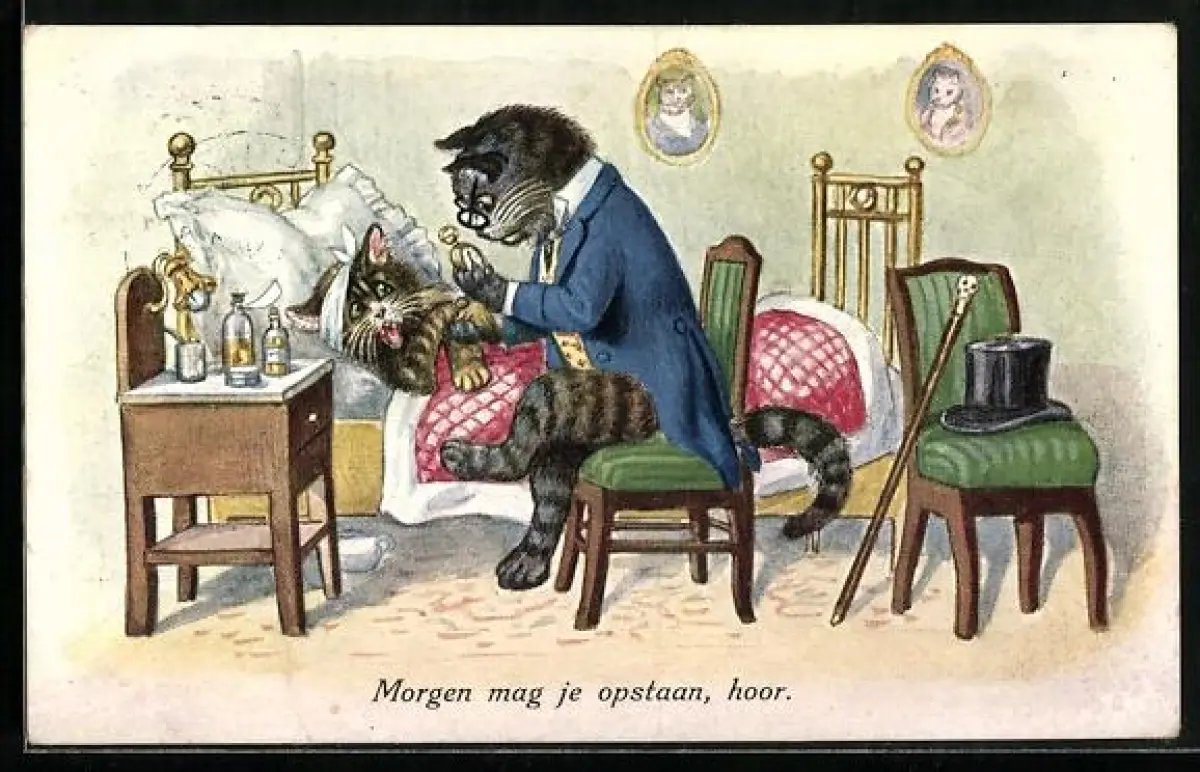 AK Katzendoktor bei einer Katze am Bett, vermenschlichte Tiere