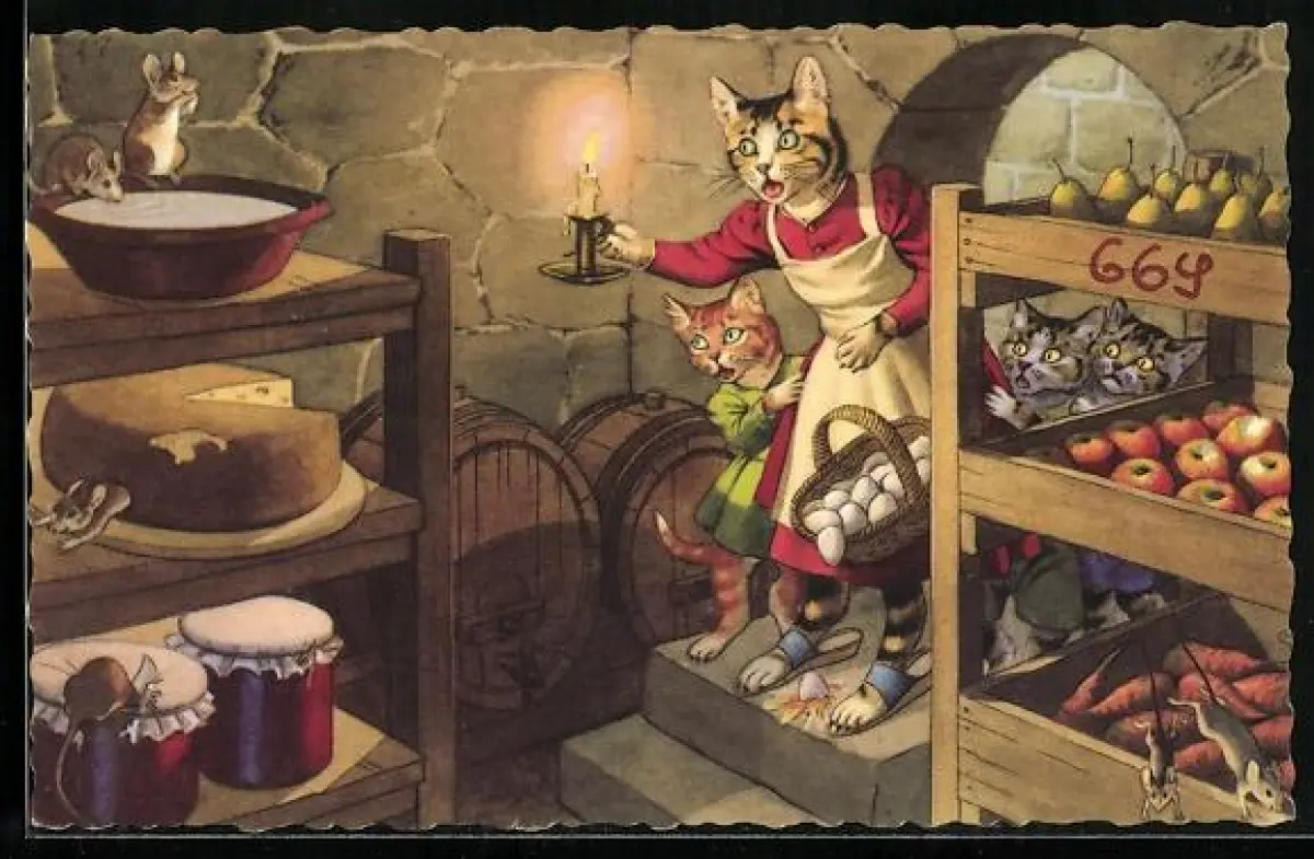 AK Katzenmutter entdeckt Mäuse in der Speisekammer