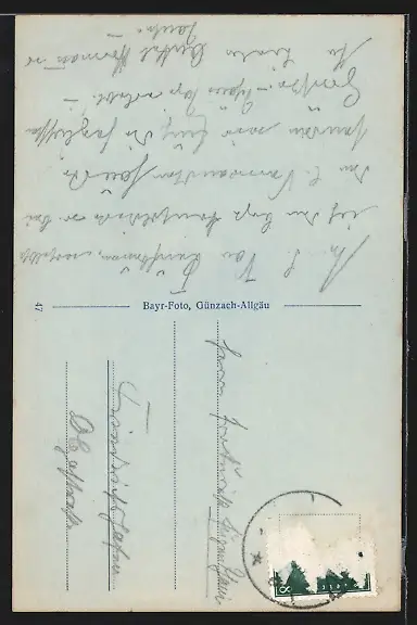 Personenbezogene Daten auf der Rückseite der Karte wurden durch blauen Textmarker unkenntlich gemacht. Die blauen Stellen sind auf die Vorderseite durchgeweicht und wirken sich negativ auf das Postkartenfoto aus