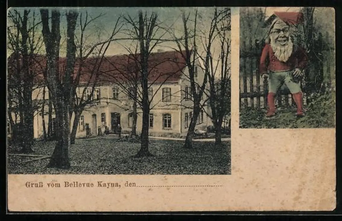 AK Kayna, Gasthof Bellevue im Grünen, Zwergen-Figur