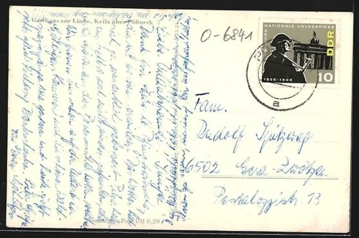 Personenbezogene Daten auf der Rückseite der Karte wurden durch blauen Textmarker unkenntlich gemacht. Die blauen Stellen sind auf die Vorderseite durchgeweicht und wirken sich negativ auf das Postkartenfoto aus