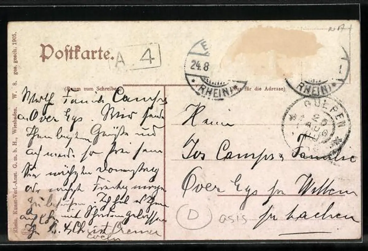 alte Ansichtskarte, gelaufen, Briefmarke entfernt, rückseitig Oberflächenschaden, rückseitig Klebe- und Papierreste, Eckknicke rechts