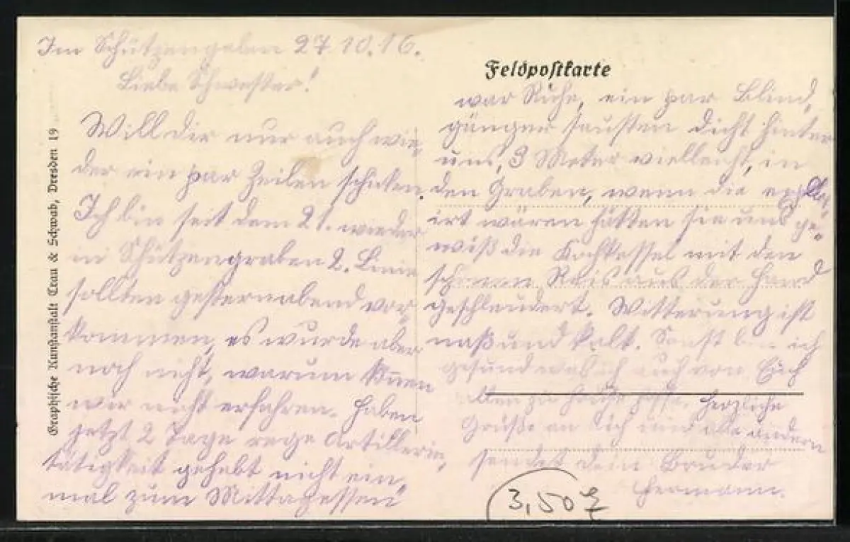 Personenbezogene Daten auf der Rückseite der Karte wurden durch blauen Textmarker unkenntlich gemacht. Die blauen Stellen sind auf die Vorderseite durchgeweicht und wirken sich negativ auf das Postkartenfoto aus