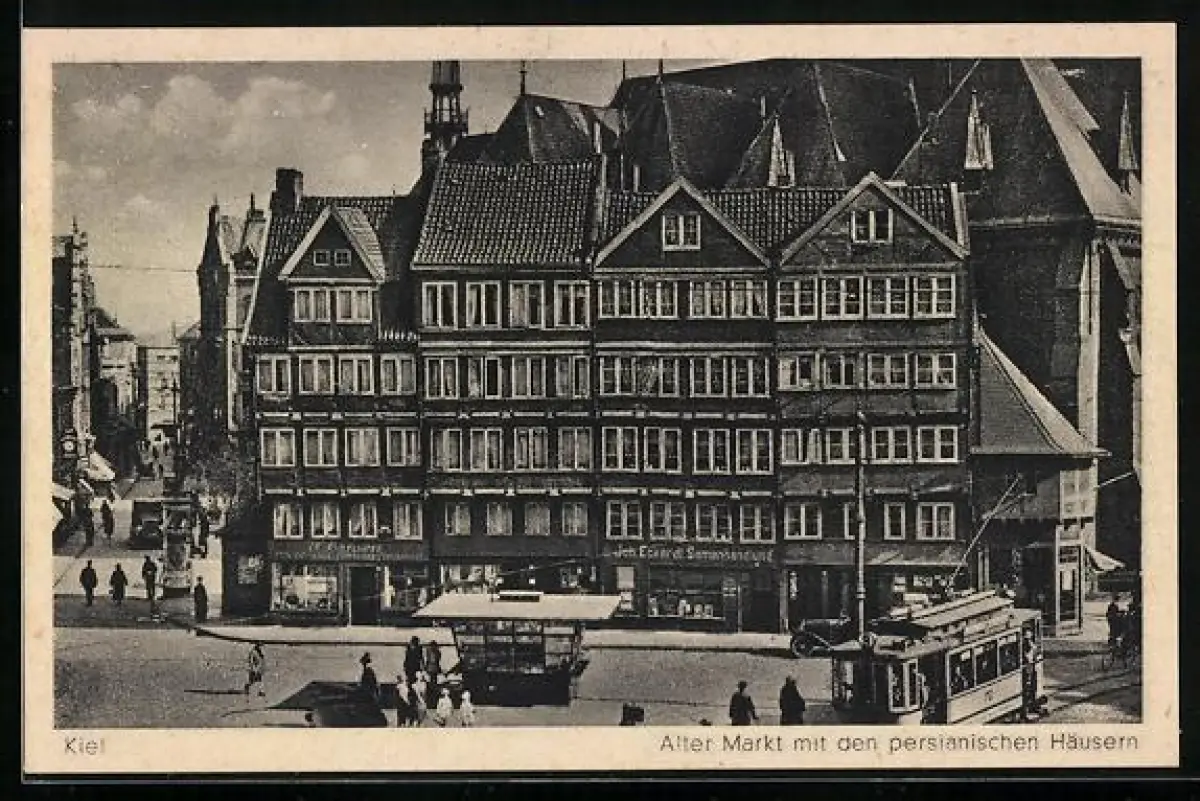 AK Kiel, Alter Markt mit den persianischen Häusern und Strassenbahn