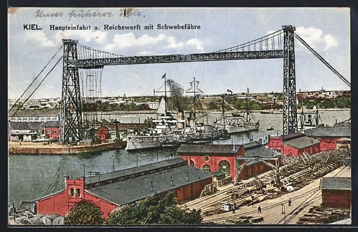 AK Kiel, Haupteinfahrt z. Reichswerft mit Schwebefähre, Schiffe