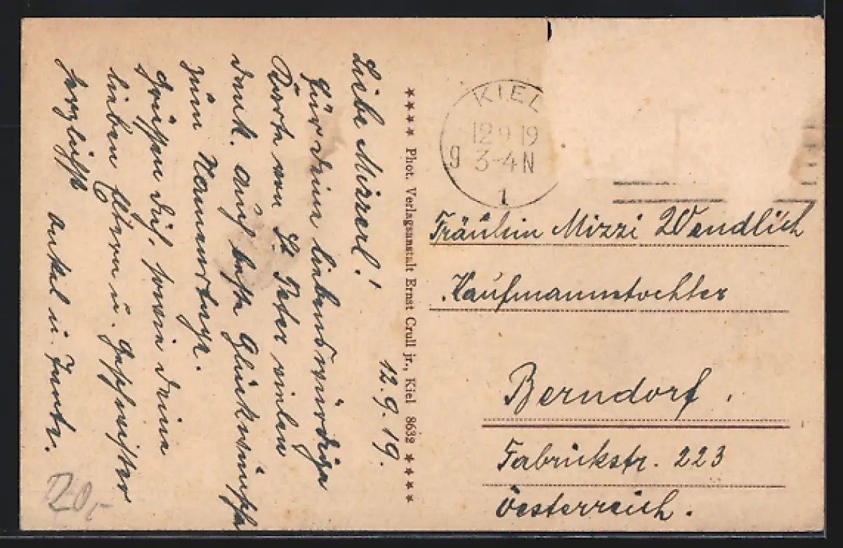 alte Ansichtskarte, gelaufen 1919, Briefmarke entfernt, rückseitig Oberflächenschaden, minimaler Einriss oben mittig, guter Zustand