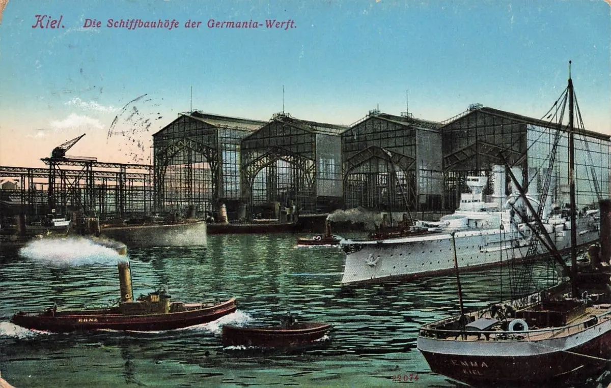 AK Kiel Schiffbauhöfe Germania-Werft Schiffe Schleswig-Holstein 1912 Postkarte
