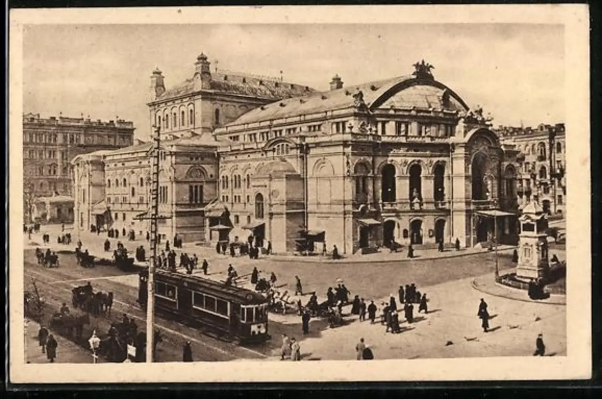 AK Kiew, Vor dem Opernhaus, Strassenbahn